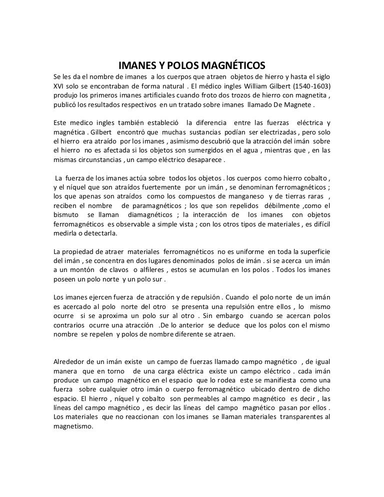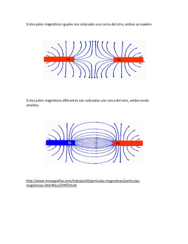 Los polos del mismo tipo se repelen y los de distinto tipo se atraen. Esta propiedad se llama magnetismo. El imán es un cuerpo creado por varios materiales dependiendo el tipo de imán que produce un campo magnético en torno a los polos el polo norte y el polo sur que hace la función de atracción o rechazo hacia otros imanes elaborados con materiales ferromagnéticos.