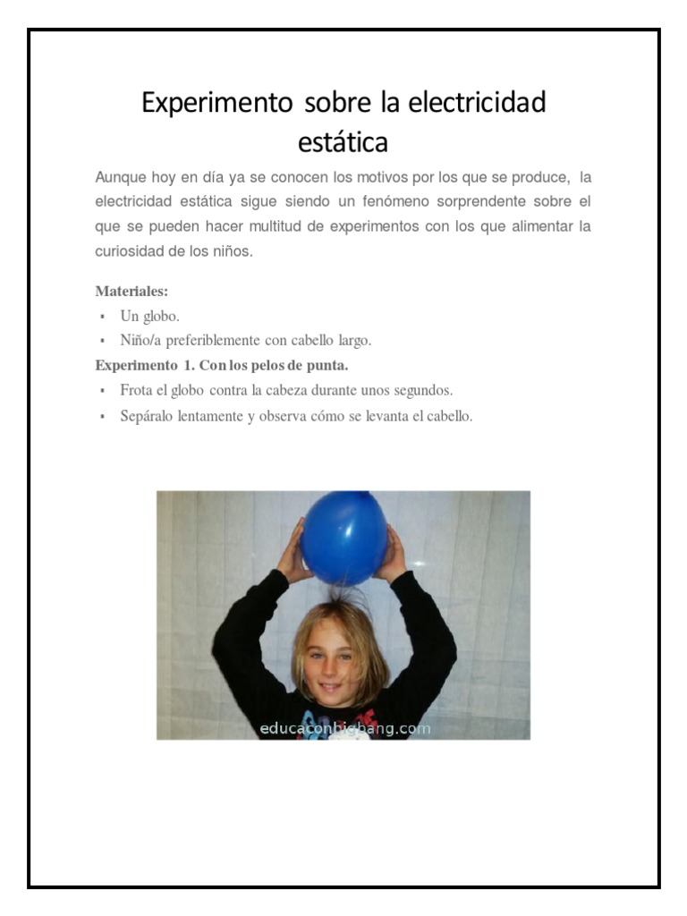 Cuando frotas un globo con tu cabello quedan con estática y si separas el globo verás los cabellos pegados a él. Obtiene conclusiones acerca de la atracción y repulsión eléctrica producidas al interactuar distintos materiales. Frotación y contacto así como sus efectos en situaciones del entorno.